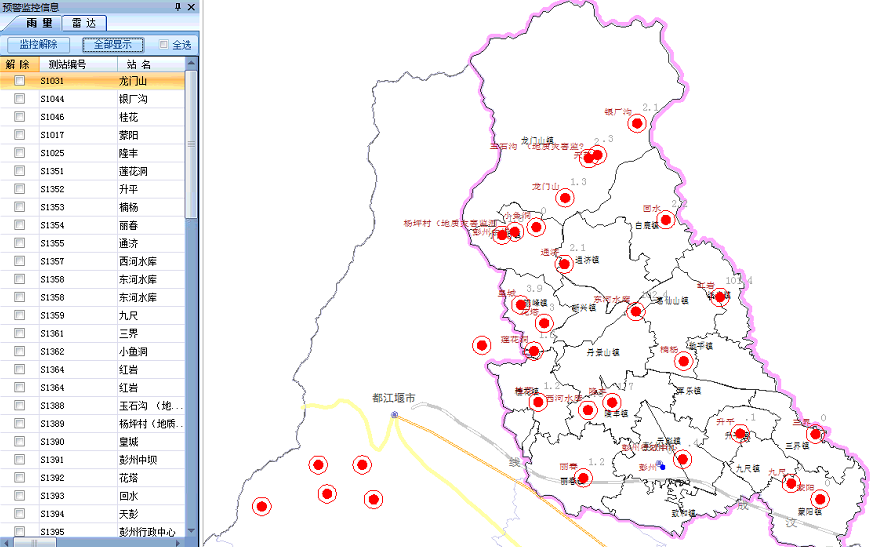 成都县级地质灾害短临预警系统是以地质灾害监测预警与中小流域监测预警为立项目标,地质灾害监测预警以地质灾害综合危险性分析作为技术基础,基于地质环境脆弱指数分析和暴雨型突发性地质灾害发灾阈值之间的耦合关系,分析生成实时的地质灾害综合危险状况,中小流域监测预警以DEM淹没模型、水利防汛预案、面雨量计算模型等作为技术基础,计算得到中小流域的面雨量计算结果与淹没分析结果。