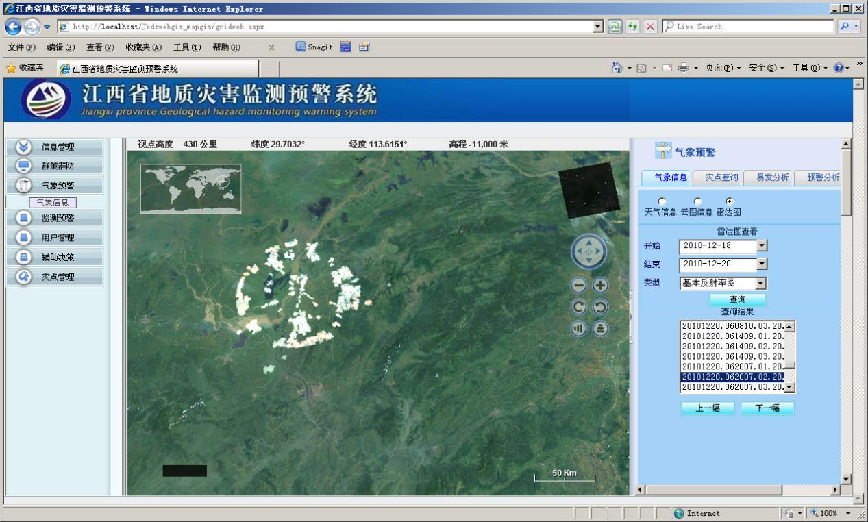 江西省地质灾害监测预警系统主要围绕地质灾害决策管理部门的监测预警业务工作需求,以信息技术为基础,以省、市、县三级架构予以建设,立足实现及时、科学的地质灾害气象风险预警预报分析,提高各单位对突发性地质灾害的预警预报能力,提升对各级地灾决策管理部门处理突发事件的辅助决策能力。